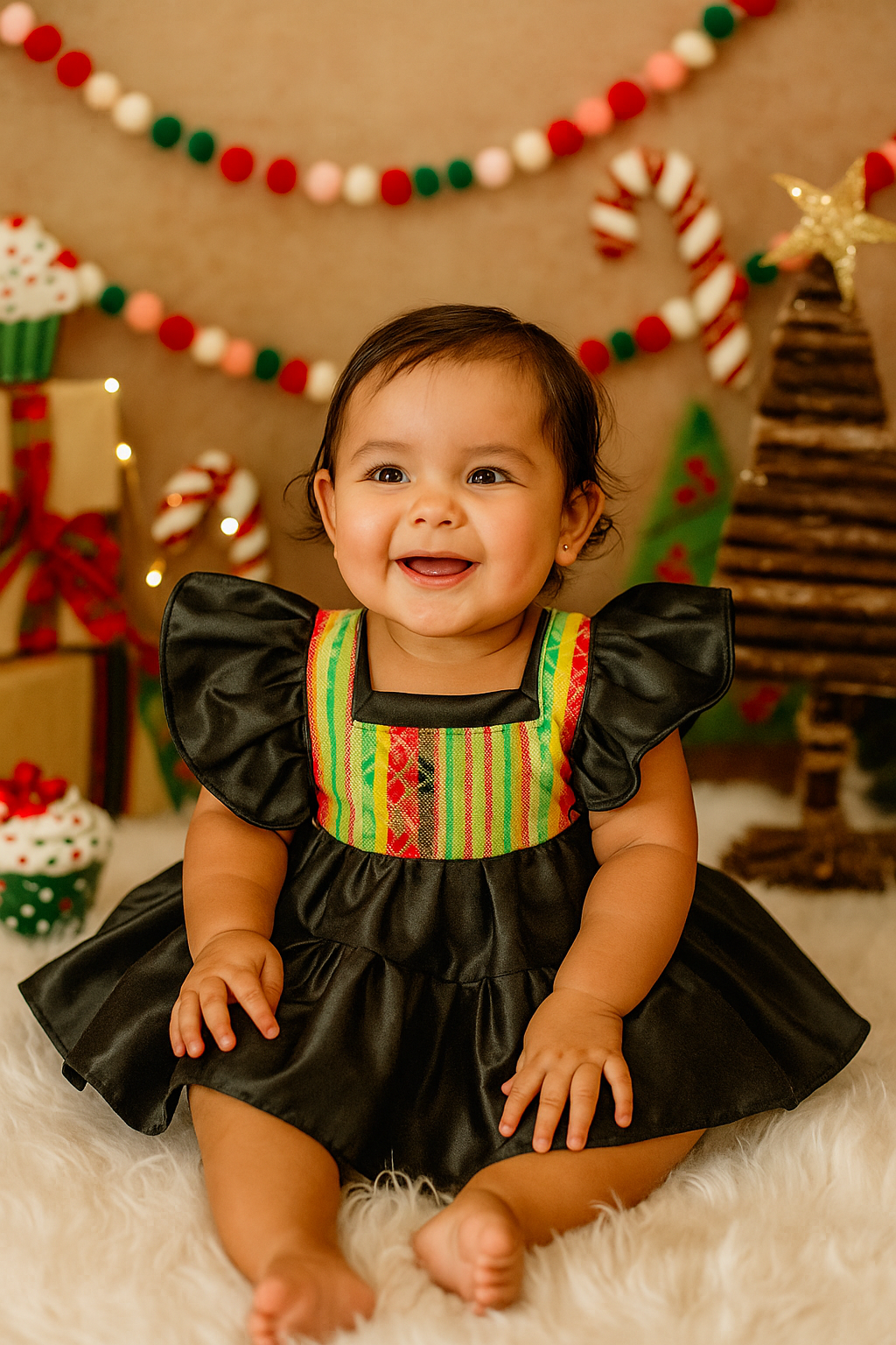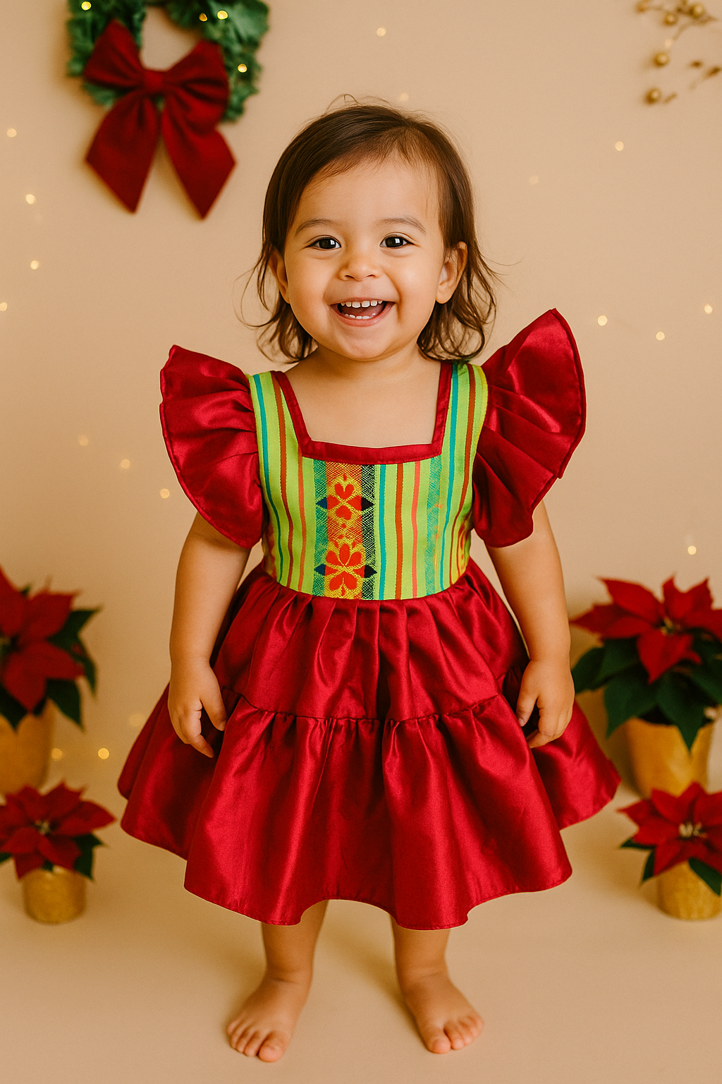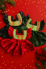 Celebrate the season in style with our festive handmade toddler dresses — crafted with luxurious satin and authentic Mexican cambaya fabric. Each dress features ruffled sleeves, a full twirl skirt, and vibrant woven details inspired by traditional Mexican textiles. Perfect for holiday photos, family gatherings, and festive celebrations.