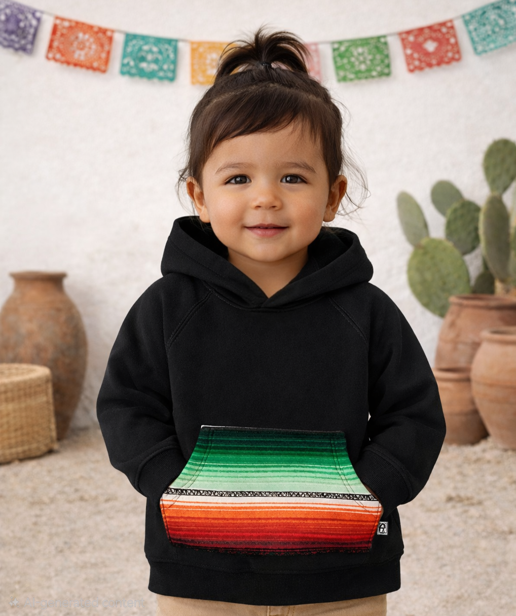 Our Customized Toddler Hoodies featuring vibrant Mexican sarape accents. Perfectly blending tradition and comfort, this hoodie showcases sarape fabric details on the hood and pocket, adding a unique cultural flair to your child’s wardrobe.