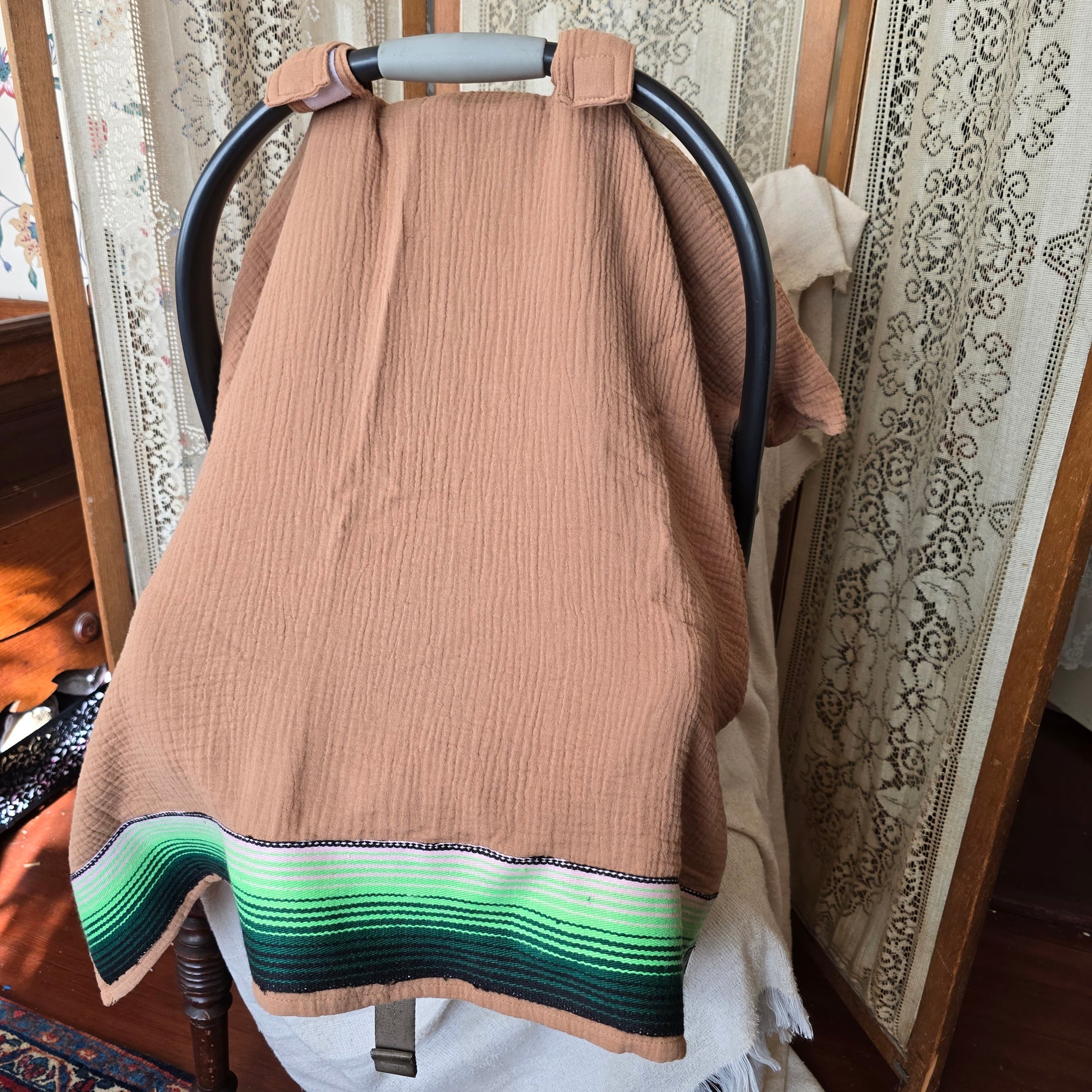 Protect your little one in style with this Muslin and Mexican Sarape Baby Car Seat Cover. Combining functionality and cultural flair, this cover is perfect for shielding your baby from sunlight, wind, and unwanted attention while on the go.