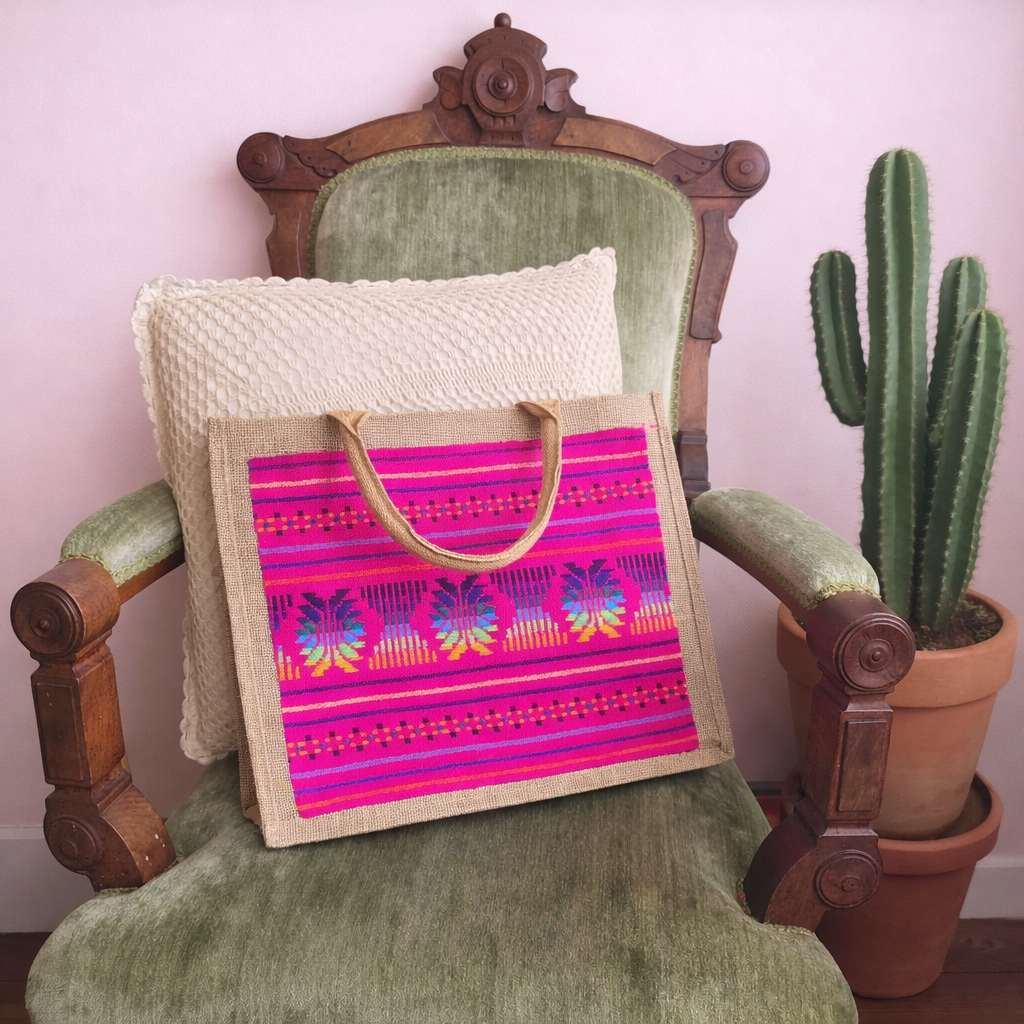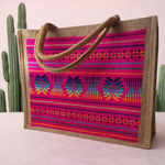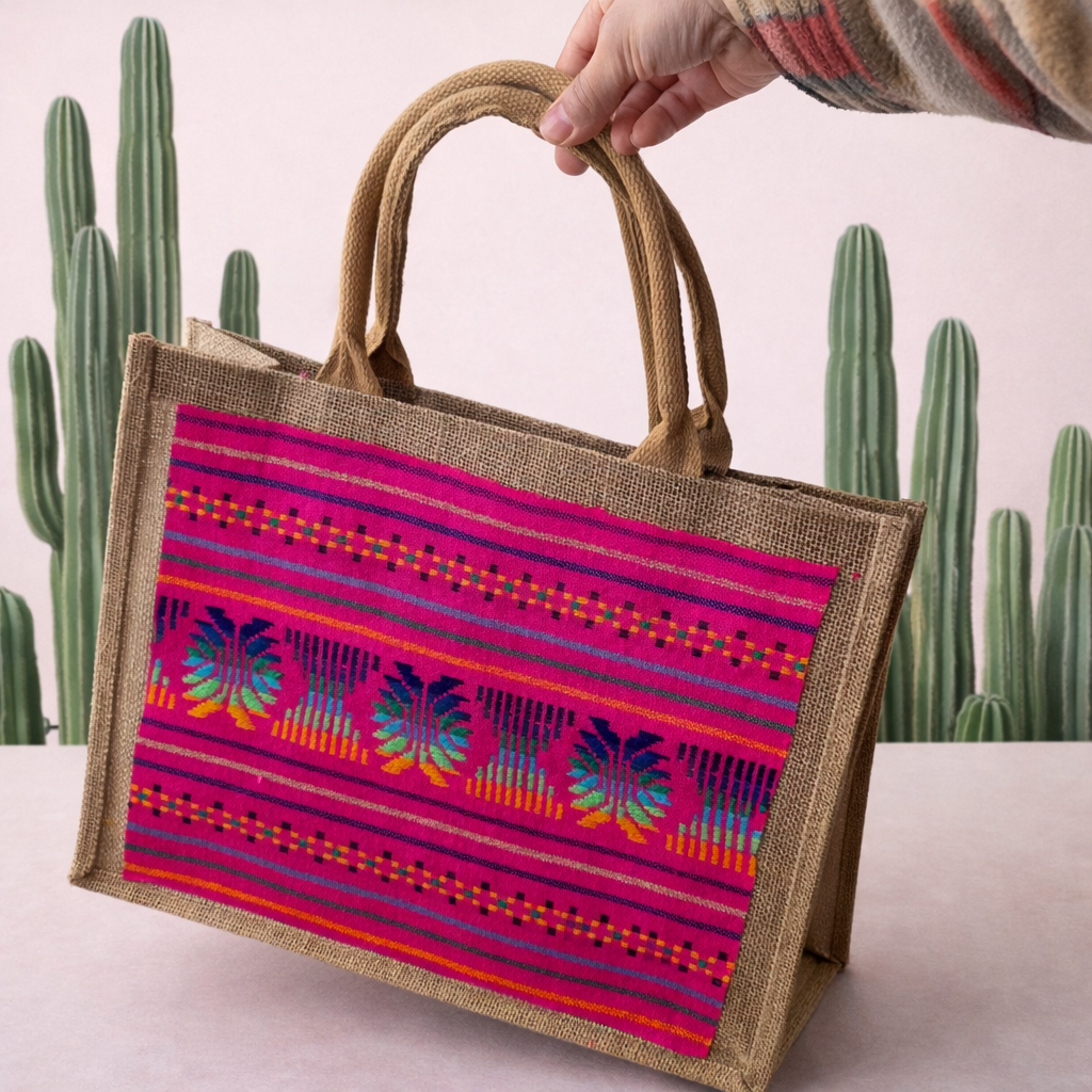 Make a statement while carrying your essentials with our Cambaya Embellished Burlap Tote, exclusively at shopqueenofmyheart.com. This 15x13" tote features a sturdy natural burlap base paired with a vivid panel of authentic Mexican cambaya fabric — a celebration of tradition, color, and craftsmanship.